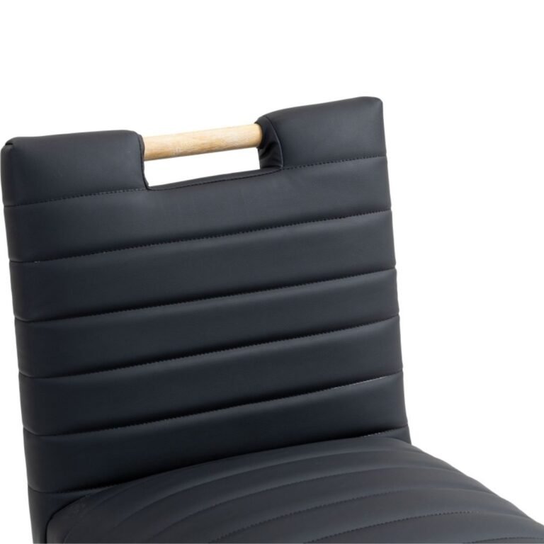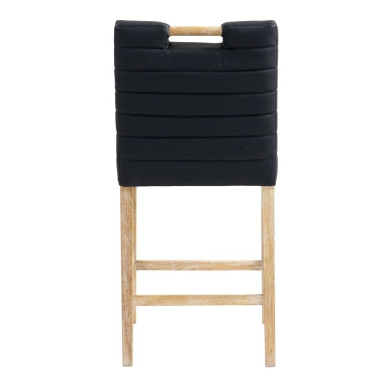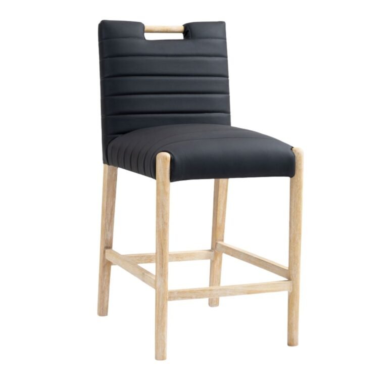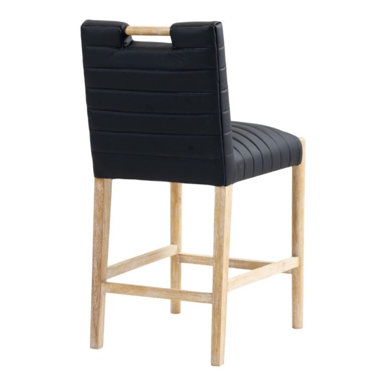 A perfect fusion of modern elegance and eco-friendly luxury is the Aimee black vegan leather counter stool. Upholstered in sleek vegan leather, this counter-height stool offers a chic, contemporary look while maintaining a commitment to sustainable living. The padded, quilted design featuring solid natural oak wood legs creates a stunning contrast between its soft upholstery and minimalist frame.