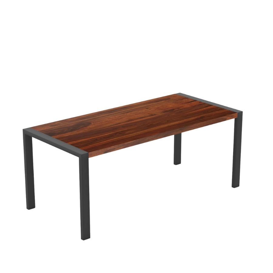 Elevate your dining area with this solid wood rectangular dining table, featuring a refined oval-shaped metal base that blends modern elegance with everyday functionality. The richly finished solid wood tabletop showcases beautiful natural grain patterns, creating a warm contrast against the sleek black metal base.