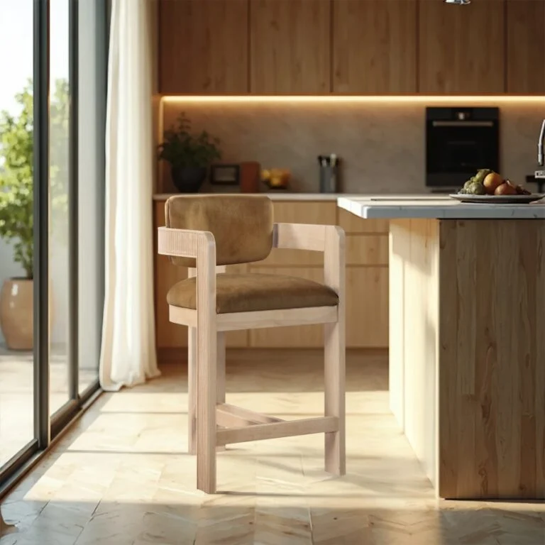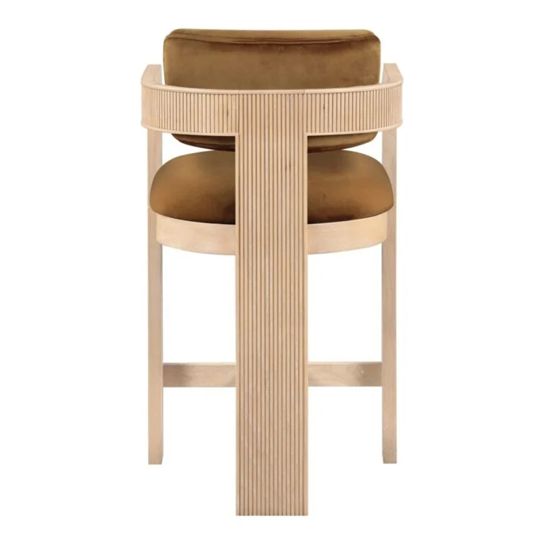 Elevate your counter seating with the Sacha saddle velvet upholstered counter stool, a perfect blend of refined texture and timeless craftsmanship. Wrapped in a soft, striking 460 GSM velvet, this stool offers both depth and sophistication. The solid wood frame, finished in a natural tone, showcases elegant fluted detailing, adding a touch of classic artistry.